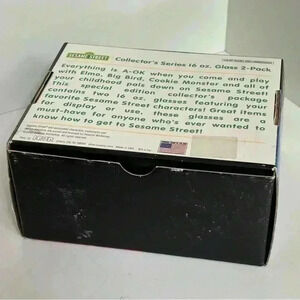 2012 Collectors Series Sesame Street limited edition 16 oz glasses made in USA. Peak hipster era collectible featuring Bert & Ernie “Hipsters” and Big Bird & Snufflepagus “Homies”. Both glasses are in unused condition with no damage or wear. The box has shelf wear and a ripped corner on the front but is still sturdy and displayable.