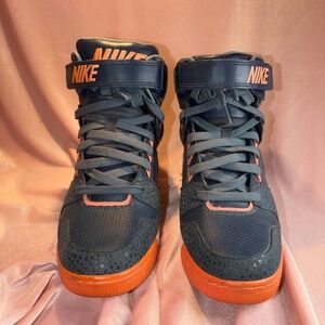 2013 Authentic Nike Air Max 1 Mid Sneakerboot in squadron blue, dark grey, and coral. Stylish high-top with ankle strap and visible Air cushioning for comfort. Premium safari-textured overlays give a unique look. Gently worn and in solid condition.