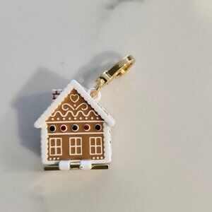 The charm is designed in the shape of a gingerbread house. It opens to reveal a tiny gingerbread man connected by a chain.