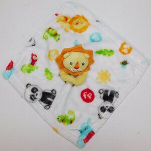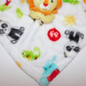 This 2016 Fisher Price Lion Security Blanket with jungle animal images Plush Baby lovey nunu Soother is in great clean bright SOFT Condition with tush tag still attached. Blanket is 100% Polyester - Machine washable. Blanket measures 12" x 12". Features print pictures of Panda and Chameleon .