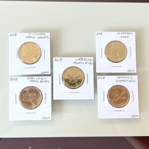 Celebrate special occasions with these 2018 commemorative Loonies from Canada! Available in Oh Canada, Wedding, Birthday, Newborn and Holidays designs, each coin is a unique and meaningful addition to any collection. The 5 Coins are expertly crafted to showcase the Oh Canada Maple Leaves, the Wedding Doves and Rings, The Birthday Cake, The Newborn Crib and Teddy Bears and the Season's Greeting Mistletoe and Candy Canes on the reverse side!