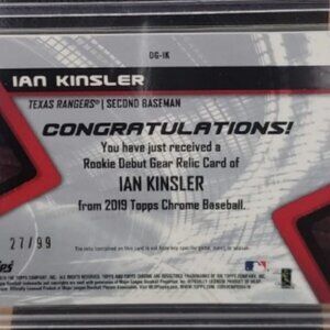 Celebrate the career of veteran second baseman Ian Kinsler with this 2019 Topps Chrome Debut Gear Green Refractor, numbered #/99. This limited edition insert features a game-used memorabilia swatch paired with a vibrant green refractor finish, making it a standout collectible for any Kinsler fan or Topps Chrome enthusiast. A sharp, low-numbered parallel from a flagship chrome release!