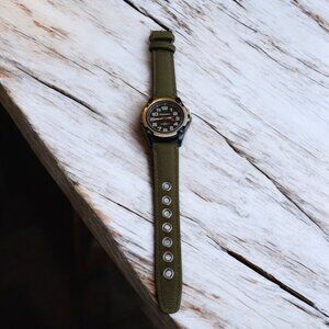Adventure meets style with this 2022 Discovery Channel promotional quartz watch. Featuring a rugged khaki green faux leather canvas strap and stainless steel back, it’s both collectible and practical. This watch is new without tags, never worn, and still has its plastic back protector. Quartz-powered, waterproof, and keeps accurate time (second hand shown in photos). With a 10" total length, it’s a comfortable fit for most wrists.