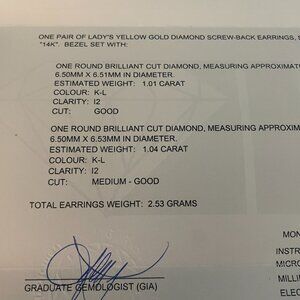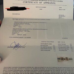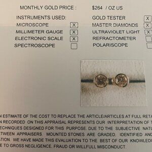 Comes on a 14K white gold 4 prong setting AND a 14K bezel gold setting ( require jeweller to reset them). Appraisal attached with all sizing details. I had them reset in white gold thinking I would wear them more, but just haven't. I think they look better quality and bigger in gold bezel setting. Note gold price in 2001 was 264/oz and today's price is $3218/oz
