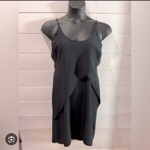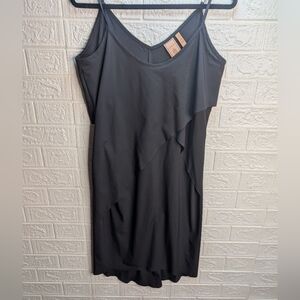 Chic black dress with asymmetrical design. Sleeveless and stylish. Perfect for any event.