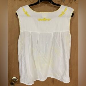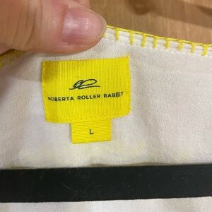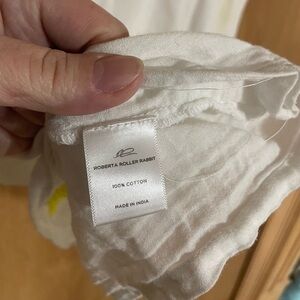 The Roberta Roller Rabbit Embroidered Peasant tunic is a relaxed fit top made of lightweight, breathable woven cotton fabric. It features a round neckline, pullover closure. The tunic is white with yelloe geometric embroidery accents and has a collarless design. It is perfect for travel, parties, or casual wear during the summer, fall, or spring seasons. The blouse is made in India and is available in size large