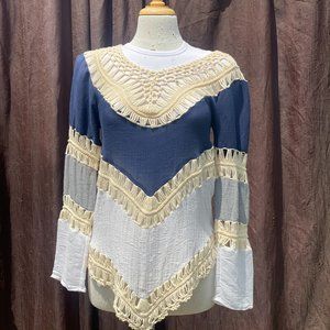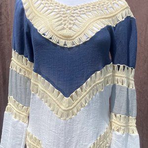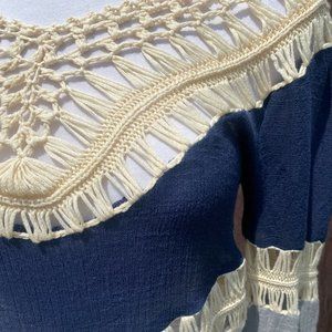 This ocean blue boho beauty is symbolic of sultry summer days. The crochet embelishments add that vintage bohemian feel to this seductive blouse. Light weight versatile and easy care make this blue-tiful blouse a must for the closet.