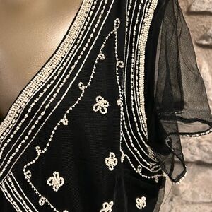 This 20’s style black top features intricate cream embroidery and beading. perfect for adding a touch of sophistication to any outfit. Size UK 20 = 16. Purchased in London. Great for the holidays.