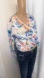 Chic floral blouse with a V-neck design. Features vibrant blue, yellow, and red patterns. Perfect for adding a pop of color. 21 inches PTP, which is pit to pit across the chest from armpit armpit 19 inches in length V-neck