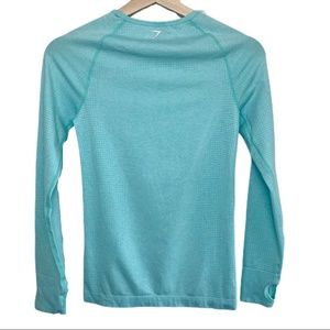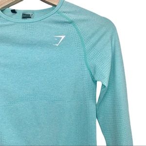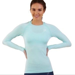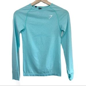 This is a Gymshark vital seamless long sleeve top Size S Pit to Pit 13” Shoulder to Hem 23” - Figure-contouring shades - Raglan sleeves - DRY technology - Thumb holes - 59% Nylon, 34% Polyester, 7% Elastane
