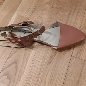 New! Tan pointed toe flats with wrap around straps and gold detail.