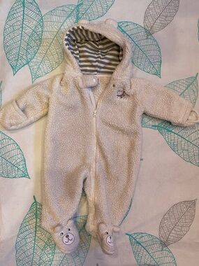 Adorable hooded footie with bear design. Soft and cozy for comfort.