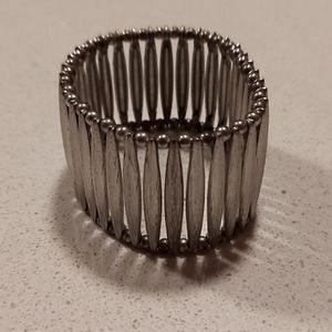 A stretchy vintage bangle from the 2000s. Silver-colored. Some age discoloration (looks bronzey or coppery in some places).
