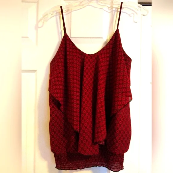 Red Layered Tank with ruffle at chest, gather at waist and adjustable straps. M