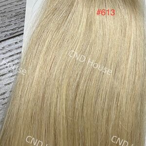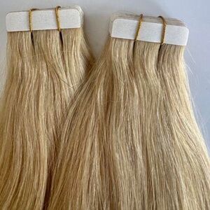 100% human hair tape-in extensions – 22” long, straight, bright blonde (#613). Each pack includes 20 tapes (50g total). Soft, silky, reusable, and heat-friendly for all your blonde hair goals.