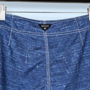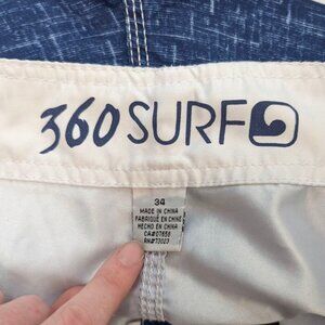 These board shorts by 360 Surf are made of 100% polyester and feature a stripe pattern with 3 different blue tones, the middle of which is itself, another stripe pattern. The board shorts have a front tie and velcro opening and a zip pocket on the right leg. There is no lining. There is normal wear, but no issues affecting wearability.
