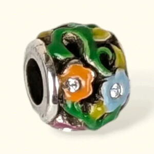 This charm by Brighton is a colourful, round little bead. It has enamel flowers of all colours around its middle, each flower having a white rhinestone in the middle. The charm does not have a jump ring and has minor wear from age and use.