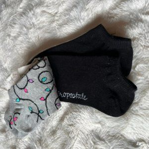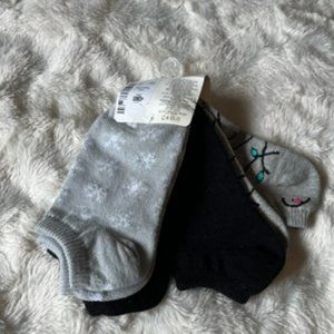 Aeropostale 3-pack Ankle Socks brand new with tags. Socks are One Size fits most. One pair is grey with Christmas tree strings of lights, one pair is solid black with Aeropostale name in white, the third pair is grey with white snowflakes. All 3 are cotton/polyester/spandex blend. Machine washable, gentle cycle. This post is for one item only. Mix and match for bundle price. Colour depends on device/screen settings and lighting in pictures. All items are from my smoke free home.