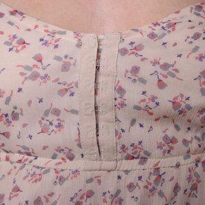 In great, pre-loved condition. Minor pilling on this inside lining (not visible while wearing). Adjustable spaghetti straps. Elastic back. Cream coloured with a dainty pink floral print. Ruffle at the hem. Fits true to size. I'm 5'7 and wear sizes XS-S.