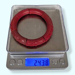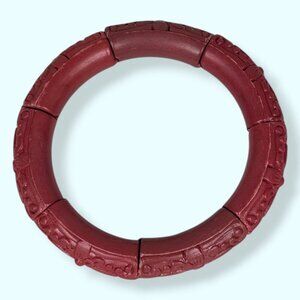This bracelet by Avon is made of a red molded plastic and is strung with an elastic cord. The bracelet is made of 7 sections of equal size that are smooth on the interior and have swirling floral details on the exterior. The design is intended to look like carved cinnabar. The bracelet has normal wear, including one section which appears to be darker than the rest, but there are no issues affecting wearability.