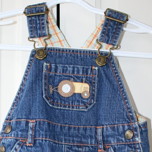 These Gymboree shortalls are size 6-12 months. They have a tractor embroidered on the front pocket. They have 3 functional pockets in the front and 2 in the back. They're in good condition but the buttons are distressed and there is some pilling on the plaid fabric inside the overalls and on the inside pockets. 100% cotton.