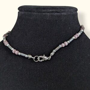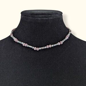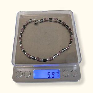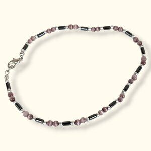 This beaded anklet is made of a silver tone metal and has a lobster clasp closure. There is a chance this is a bracelet (but it's so big!) or a necklace (but it's so small!), but the only way the length of this piece makes sense to me is as an anklet. I guess it could be a child's necklace? The piece is beaded with small purple glass beads, cylindrical hematite beads, and small silver spacer beads between each. I took pictures of this piece on a necklace bust because I'm not showing off my hairy ankles. The anklet has normal wear, and the shape is slightly wonky from storage, but there are no issues affecting wearability.