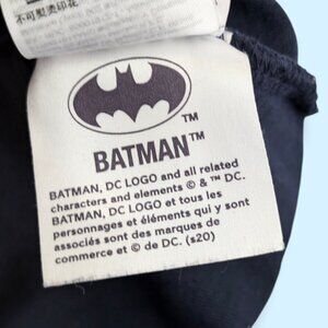 This t-shirt by Gap / DC is made of 100% cotton and is a dark blue with short sleeves. The shirt features a single black and yellow classic Batman logo graphic in the middle of the chest. There is some cracking in the yellow of the graphic from wear and wash. The shirt has normal wear, but no issues affecting wearability. This shirt is not vintage; it's a 2020 release.