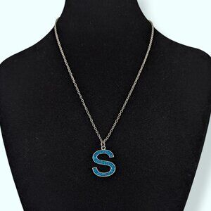 This necklace is made of a silver tone metal and has an adjustable lobster clasp closure. The chain is standard and sturdy and the pendant is shaped like the letter "S". The back of the pendant is silver and plain, and the front is blue and sparkly. There is normal wear.