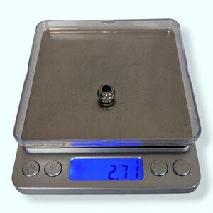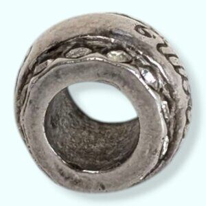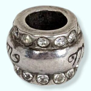 This bead charm by Brighton is made of a silver tone metal and has small white/clear rhinestones around the top and bottom. The center of the charm says, "MOM" in a cursive script on opposite sides of the charm. There is normal wear throughout, please see the pictures!