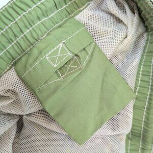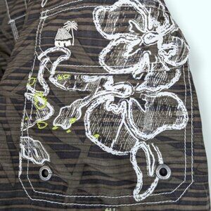 These swim trunks by Caribbean Joe Island Supply Co are made of 100% polyester and feature a white and green floral foliage pattern on a dark brown striped background. The trunks have a front tie drawstring, a somewhat elastic waist, 2 front pockets, 2 side cargo pockets, a small inner velcro pocket, and a white inner net to keep everything in place. There is normal wear, but no issues affecting wearability.