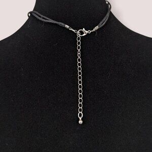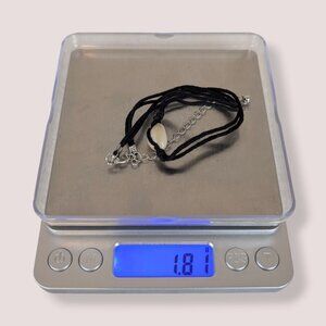 This necklace is made of a doubled black cord and has an adjustable lobster clasp closure made of a silver tone metal. The necklace is choker length and casual, with a single white shell knotted in place in the center of the front. There is normal wear but the length is the only thing that might affect wearability for you.