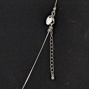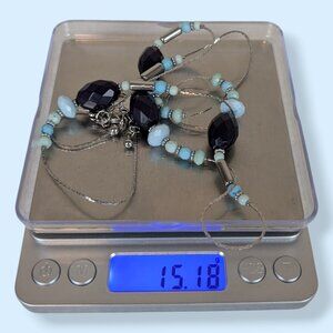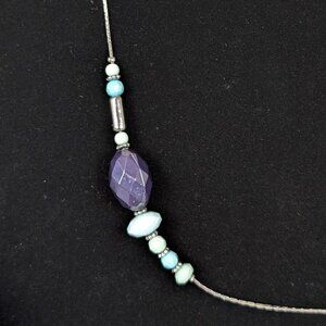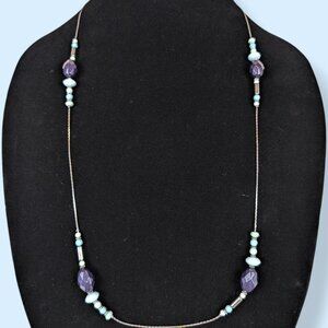 This necklace by Charming Charlie is made of a silver tone metal and has an adjustable lobster clasp closure with a stamped maker's tag. The necklace chain is long, thin, and flat, and is accented by beads in 4 places. The beads are plastic and metal, made in silver, purple, and blue tones. There is normal wear, but no issues affecting wearability.