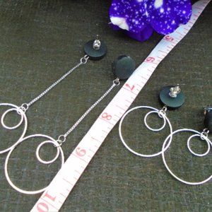 Double Circle silver dangle earrings with Black wooden round butterfly stud closure. Choose regular or long. These are very sexy everyday earrings that are light and comfortable to wear The short version has double hoops attached right to the black wooden Stud. The long version has multi hoops suspended on long box chains, They look good with anything due to their classic styling and neutral black and silver coloring.