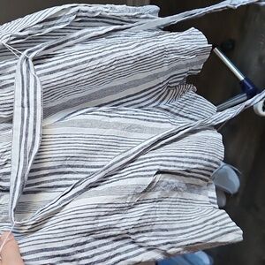 Chic striped sleeveless romper with adjustable straps and ties beautifully at waist. Perfect for any outing, as you can dress it up or down. 100% linen, excellent condition.