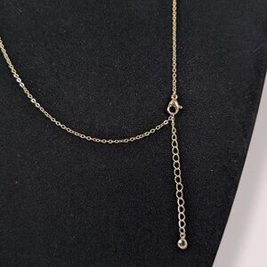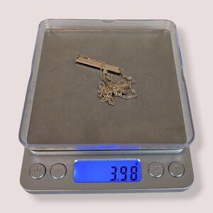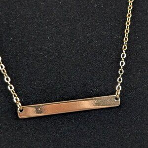 This necklace is made of a gold tone metal and has an adjustable lobster clasp closure. The chain is lightweight and dainty and attaches to the pendant on either side of it. The pendant is a long rectangular piece of metal with a smooth finish that could, in theory, have a name or something engraved on it as it is currently blank. The necklace has normal wear, including superficial marks in the surface of the pendant metal.
