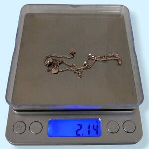 This dainty bracelet is made of a rose gold tone metal and has an adjustable slider clasp. Each chain end has a small, flat heart dangling from it, and the bracelet has small dangling white/clear rhinestones all around it. There is some wear but nothing that affects wearability.
