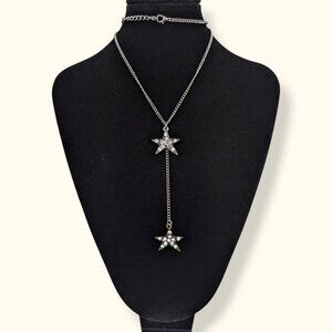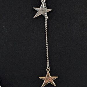 This necklace is made of a silver tone metal and has an adjustable lobster clasp closure. The chain is standard and sturdy, and the pendant hangs on it from a jump ring. The pendant consists of 2 metal stars with rhinestone accented fronts and smooth backs, one of which is right next to the main chain, and one of which dangles down below. The necklace hangs longer than pictured as I wrapped it around the top of the neck to show it all in one picture. There is normal wear, including superficial marks in the metal backs of the stars.