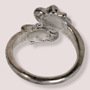This ring is made of a lightweight silver tone metal and has a wrap-around style band. The front of the ring features two spooky skulls, one on top of the other. The ring is casual and has normal wear.