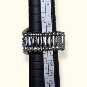 This ring is made of a silver tone metal and has an elastic band, allowing for some size variability. The front of the ring has a lustrous white faux pearl in the center with rhinestones dotting the 4 bands behind it. There is little wear, if any.