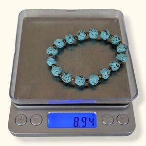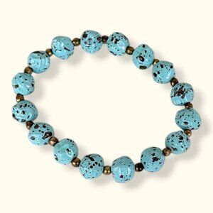 This stretch bracelet is beaded and has an elastic core instead of an opening. The bracelet is strung with 2 types of beads: large somewhat-round blue beads with brown spots (meant to look like turquoise) and small brass tone spacer beads. The faux turquoise beads are most likely a plastic or acrylic and are too warm and lightweight to be a natural stone. The bracelet has normal wear.