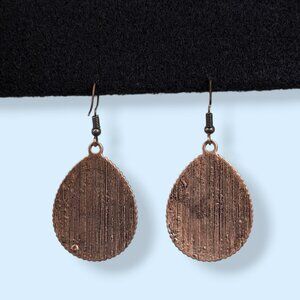 These earrings are made of a copper tone metal and have simple hooks. Each earring is shaped like a tear drop with a flat back and a bumpy, swirly, detailed front. Both earrings have a smooth, rounded turquoise stone in the center, though I believe it is an imitation, not real turquoise. The earrings have normal wear and one of the has a line on the back (pic 5) that looks like a hair, but it doesn't go through the earring.