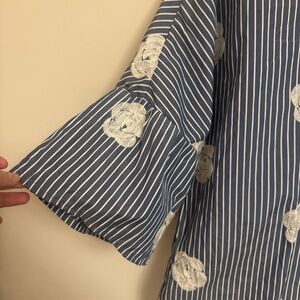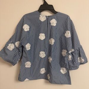 Super cute striped blouse with flower accents and flowy puff sleeves.