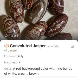 Jasper is a semi-precious stone with a huge variety of colours and patterns. Convoluted jasper is a commercial, trading name for a finely polished stone with reddish and brownish bands. The material is usually sold tumbled or carved into hearts.