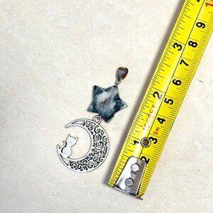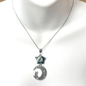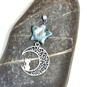 2/$20, Genuine White Green Tree Agate Star & Silver Cat on the Moon Pendant