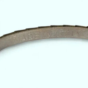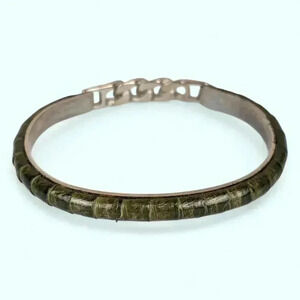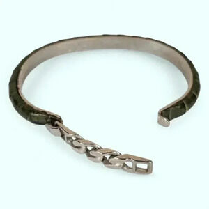 This contemporary bracelet is made of green snakeskin (very possibly and hopefully faux) and a silver tone metal. The bracelet is somewhat thin and narrow but very sturdy. The interior is silver and stamped "Made in Italy" and the front of the bracelet has a hinge closure that looks like an (unmoving) chain. This piece has signs of normal wear but nothing major and nothing that affects wearability.