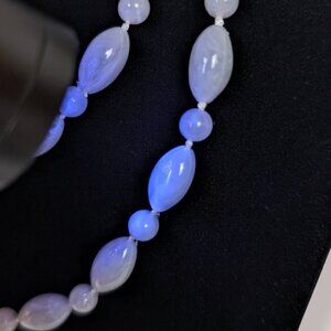 This necklace is beaded and is one long, continuous strand without an opening. The necklace is strung with grey plastic beads that alternate between small and spherical, and longer ovals. The necklace is long enough that it can be worn doubled, but can also be worn long. There is normal wear, but no issues affecting wearability.