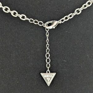 This contemporary necklace by Guess is made of a silver tone metal and has an adjustable lobster clasp closure with a triangular stamped maker's tag. The necklace has a 2-part pendant that include a silver tone half circle and a triangle with a blue felt-like fabric covering it. The back of the pendant is plain silver tone. The necklace has signs of wear from time and use but is still in good shape.