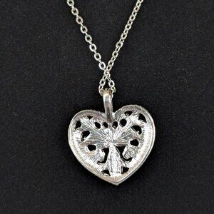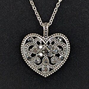 This necklace is made of a silver tone metal and has an adjustable lobster clasp closure. The pendant hangs from a fixed bail at its top and is shaped like a heart. There is a sort of dotted pattern around the exterior with swirl details in the middle, accented by cut-outs and small faceted hematite stones. The back of the pendant is fairly smooth and without detail. The necklace has normal wear, but no issues affecting wearability.