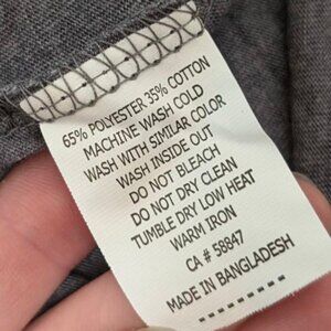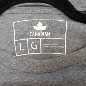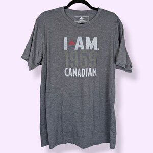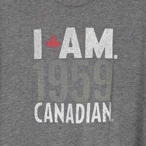 This t-shirt by Molson Canadian is made of a cotton/poly blend (65/35) and is grey with short sleeves. The fabric is very soft and doesn't feel like it has a lot of wear. The front of the shirt says, "I AM (1959) CANADIAN" with a little red maple leaf. The shirt has little wear, if any, and there are no issues affecting wearability.