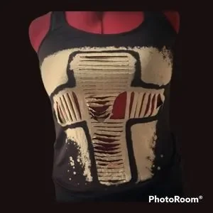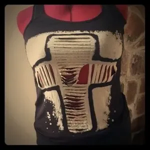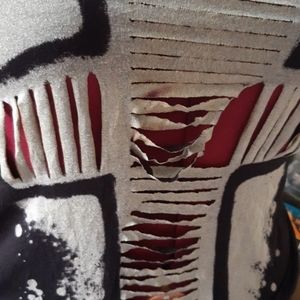 Perfect for summer! This cool top I black an grey features ripped front and sheer back and shoulders. Size tag is missing but likely a L. Measures approximately 26" shoulder to hem and 20" armpit to armpit.